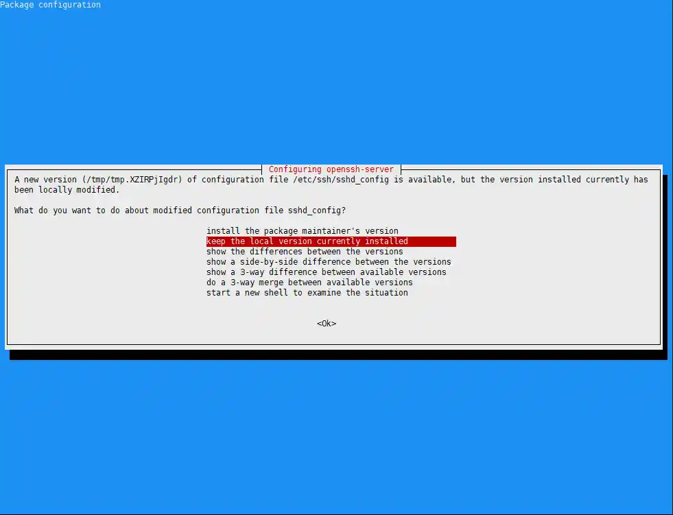 提示更新SSH版本,按向上的箭头键,选择第一项,Tab键切换到ok,确定